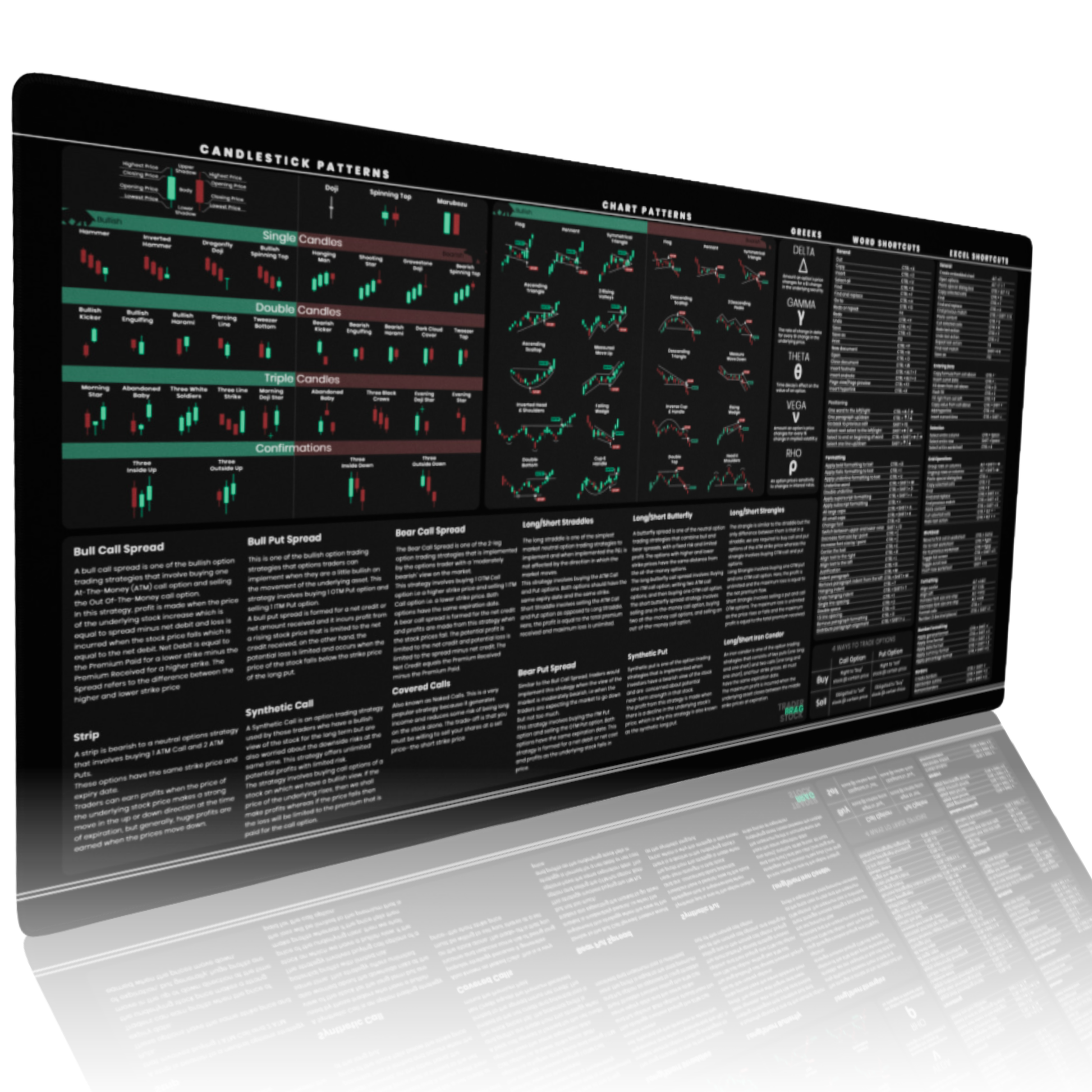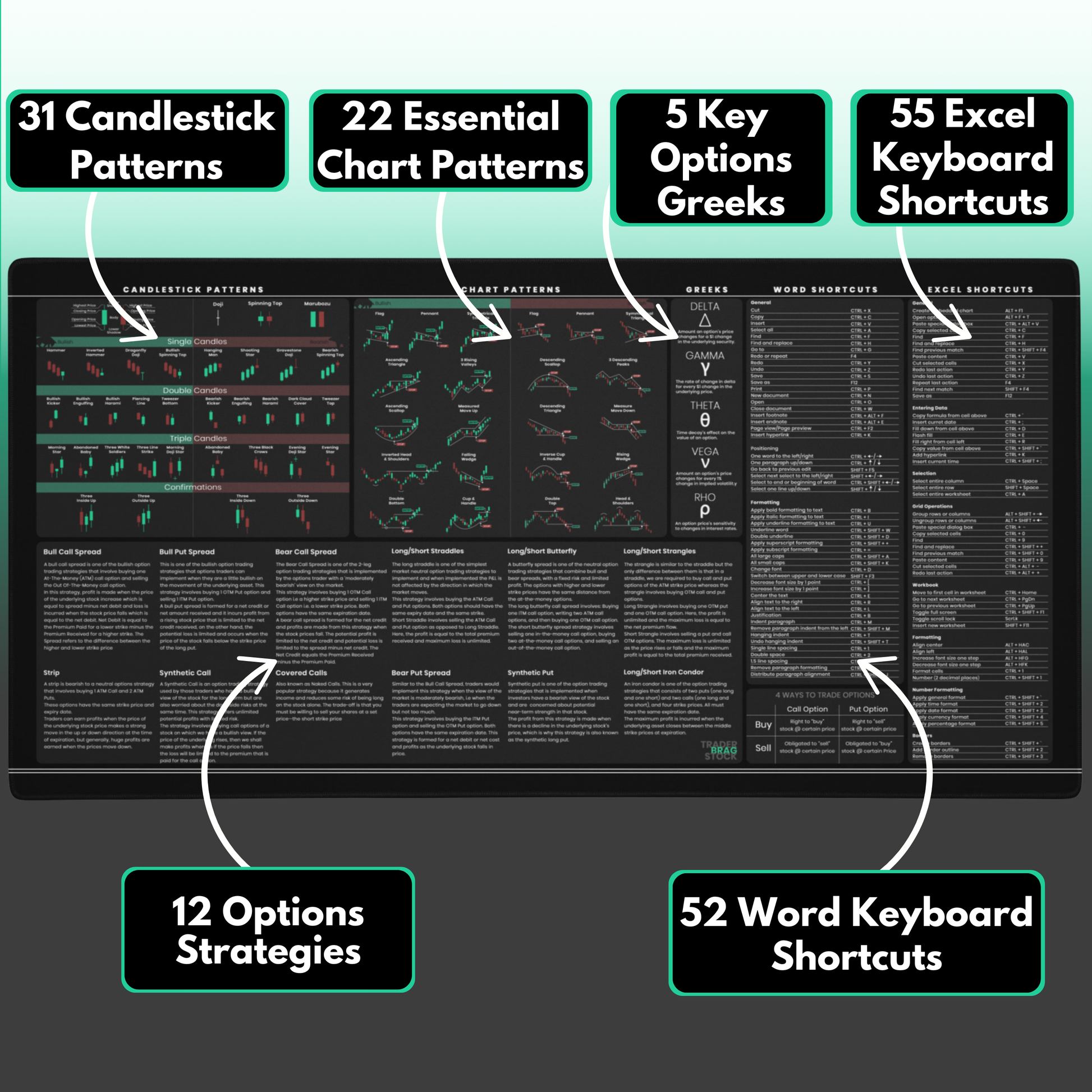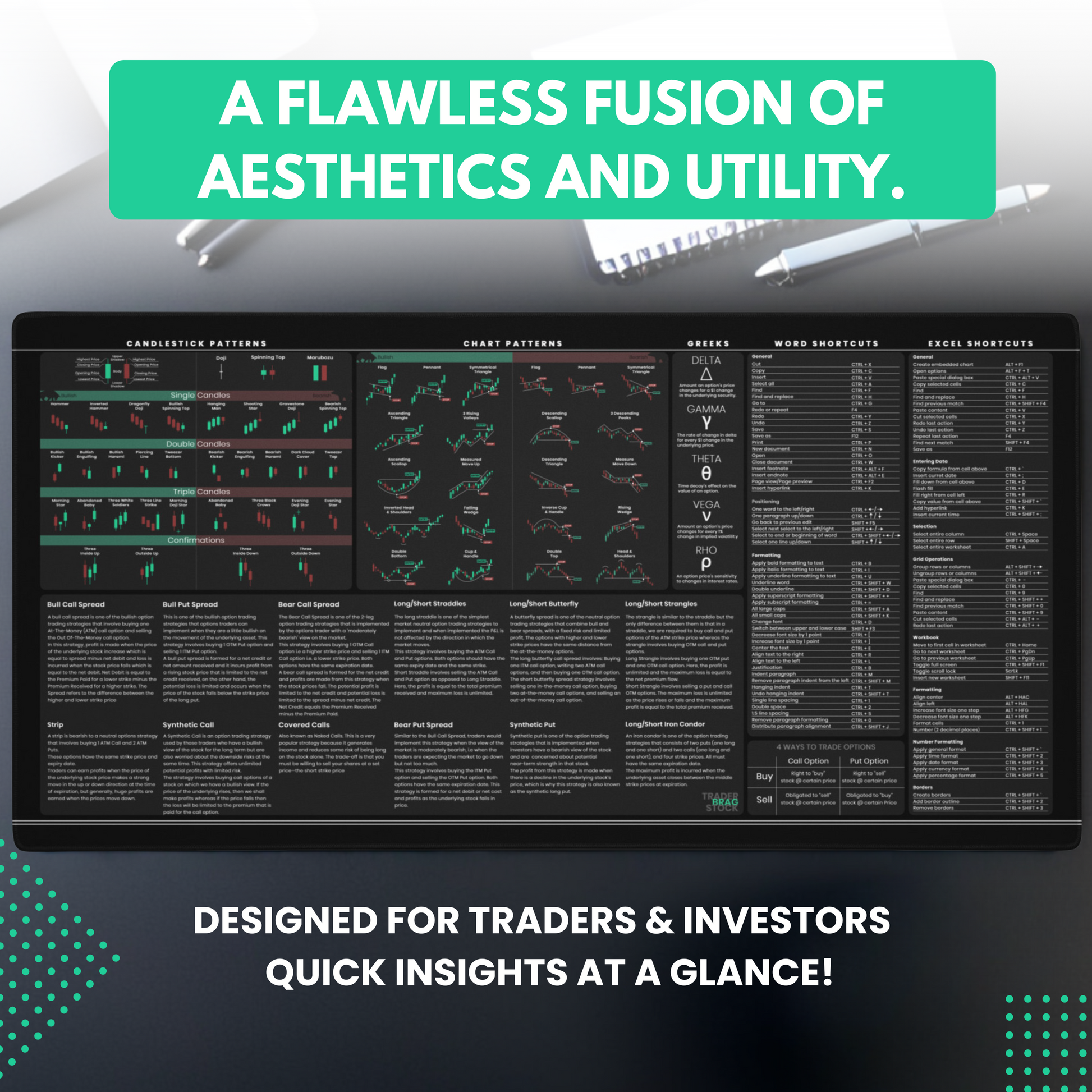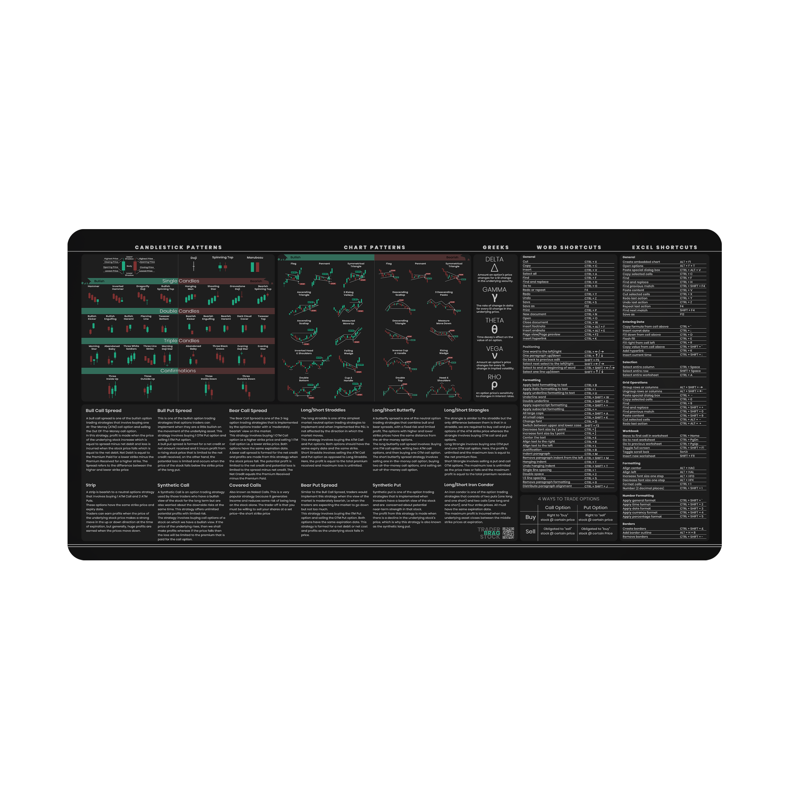 Enhance your workspace with the Options Trader's Premium Desk Mat featuring 31 candlestick patterns, 22 chart patterns, 5 key Options Greeks, and 12 common strategies for quick reference. With a cushioned surface for comfort and handy Excel and Word shortcuts, it’s designed to boost productivity and trading efficiency.