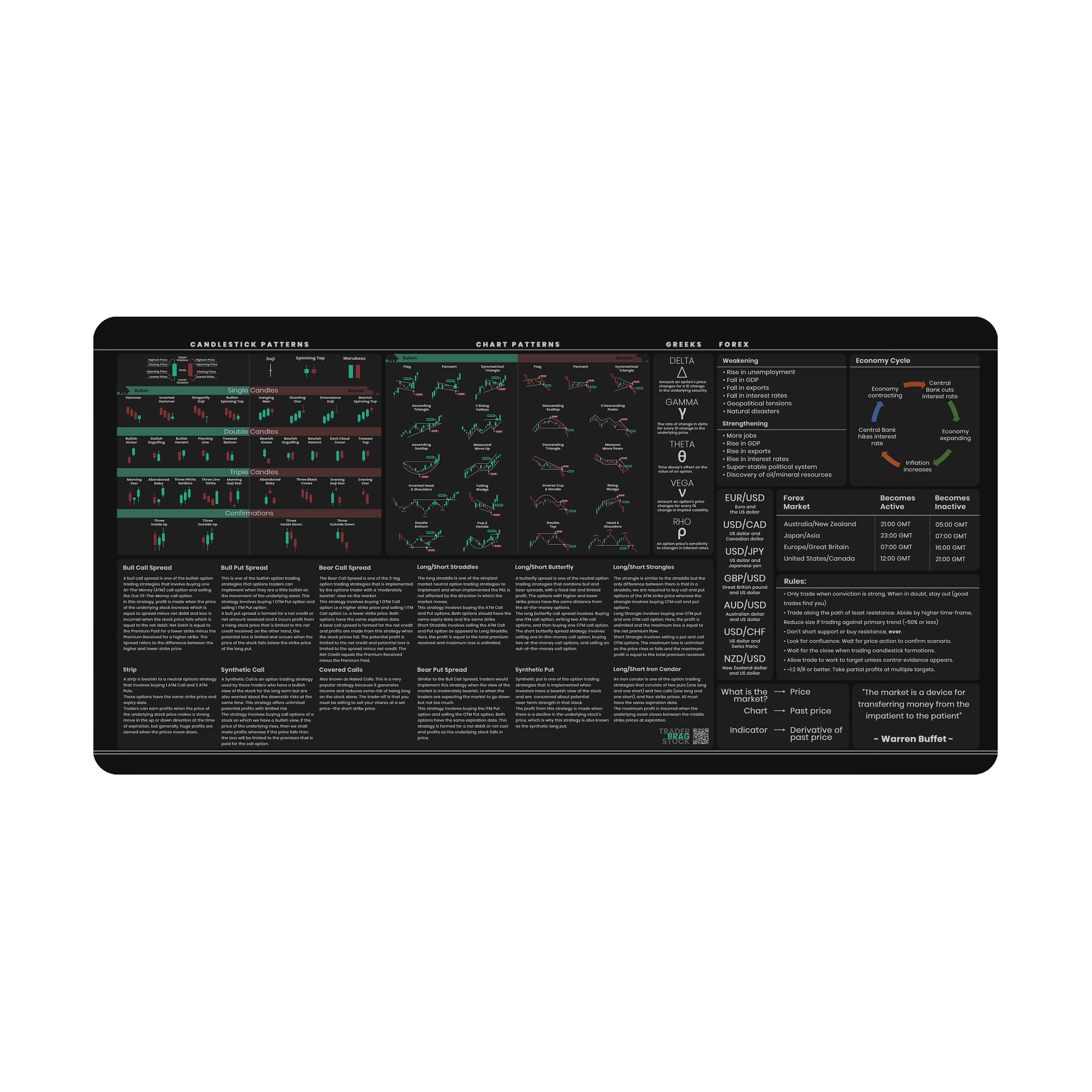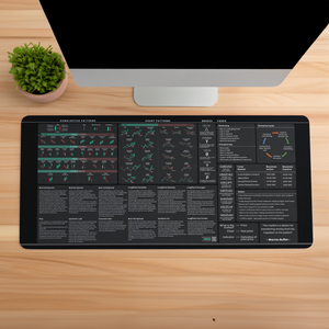 Upgrade your trading setup with the Options and Forex Trader's Premium Desk Mat. This sleek and comfortable mat, sized at 31" × 15.5", combines the best information for options and forex trading, enhancing both your workspace and productivity. Perfect for home or office use.